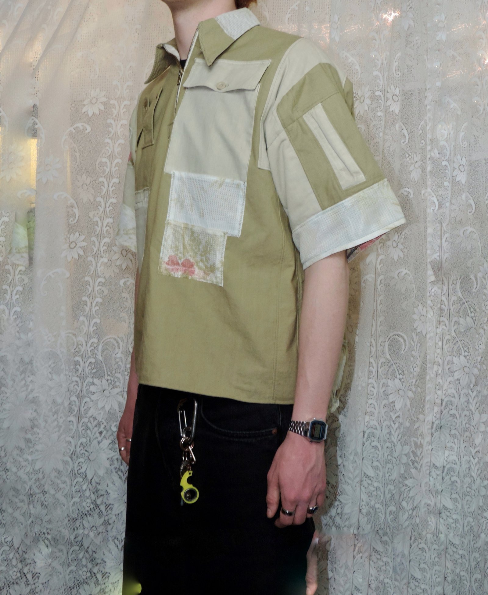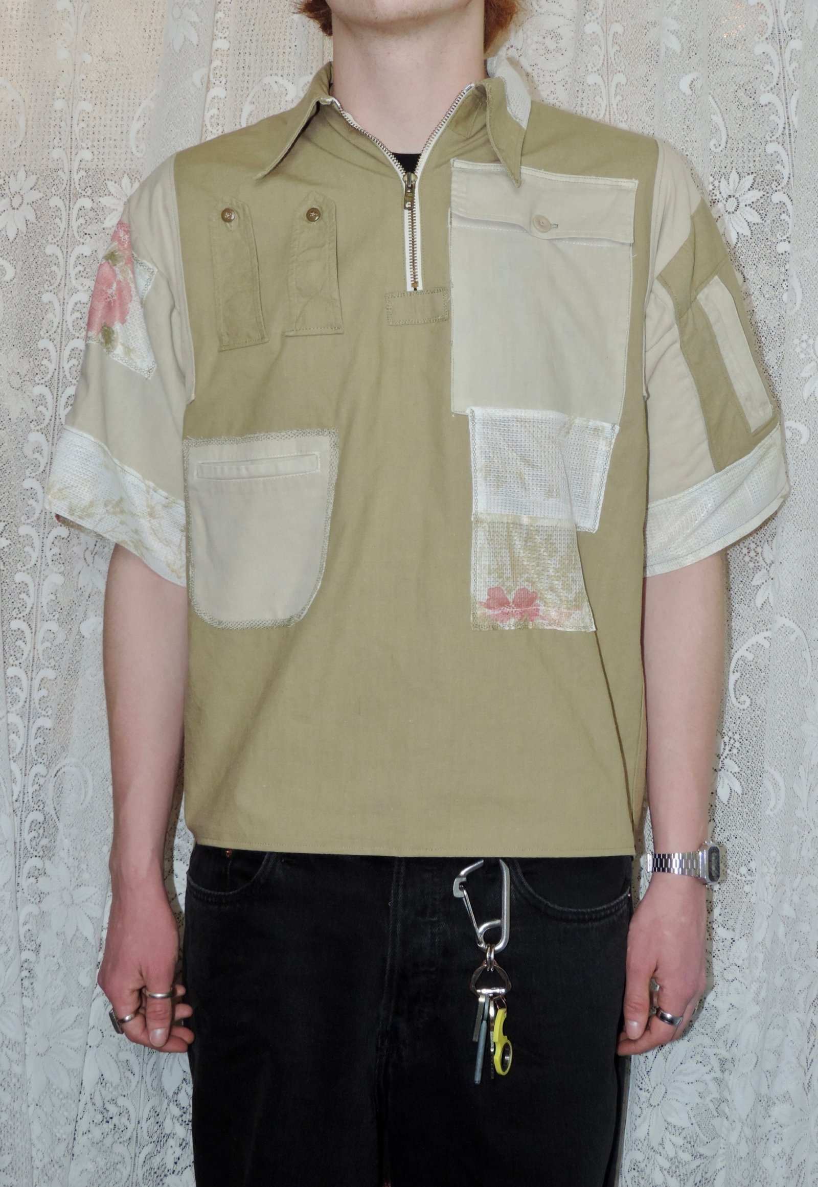 À l’origine, la chemise était un modèle manches longues à coupe ajustée ; le devant est devenu le dos et la fermeture à boutons a été transformée.