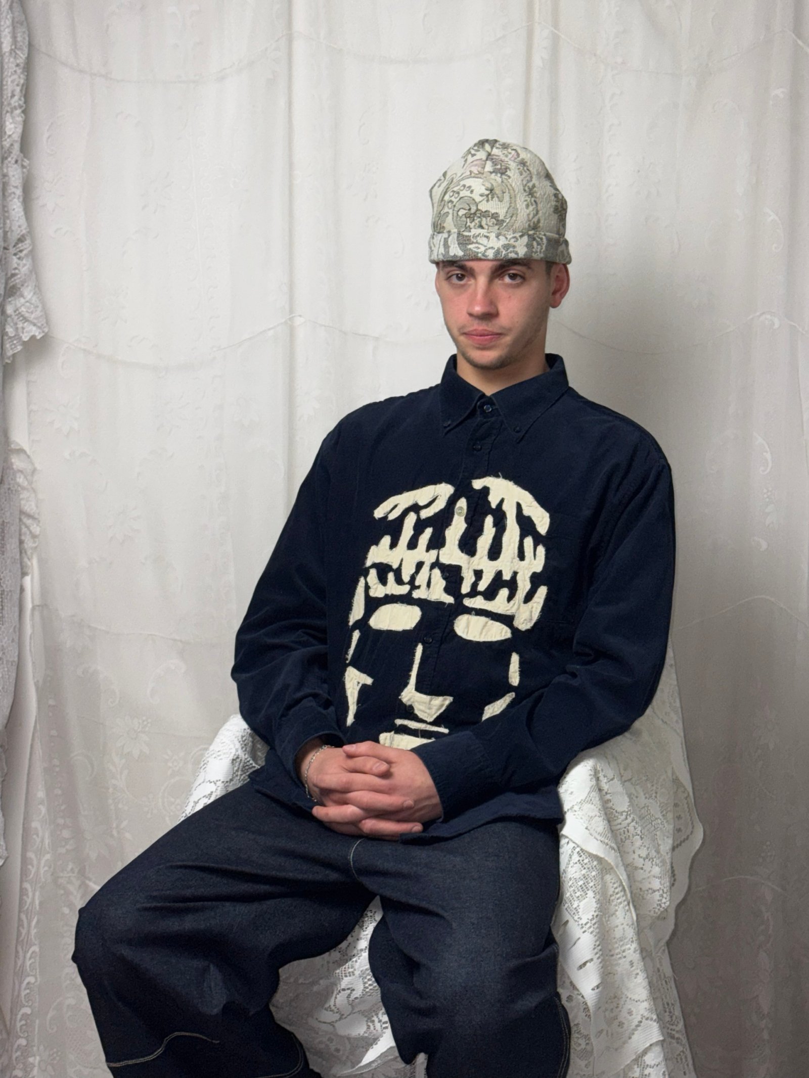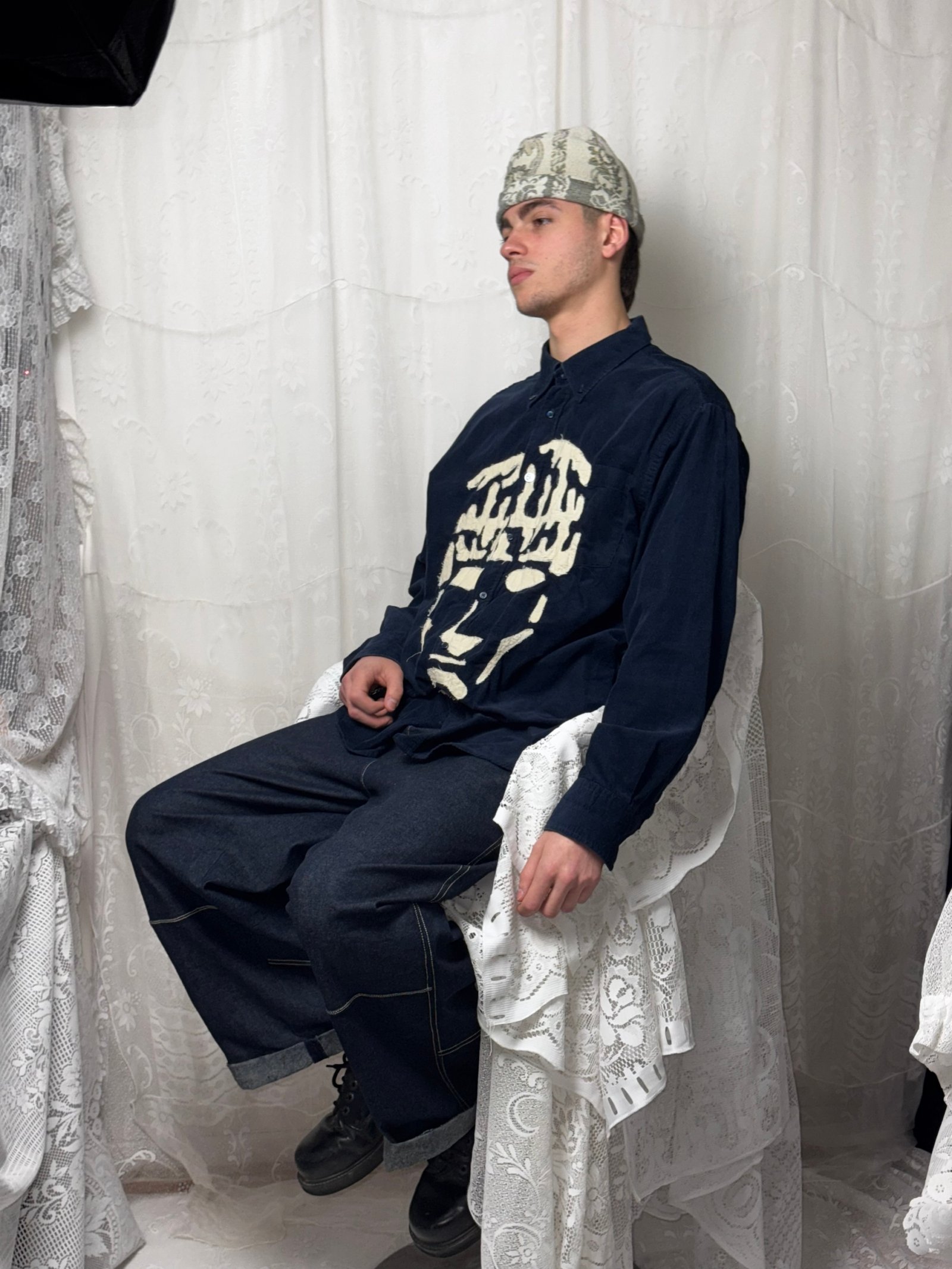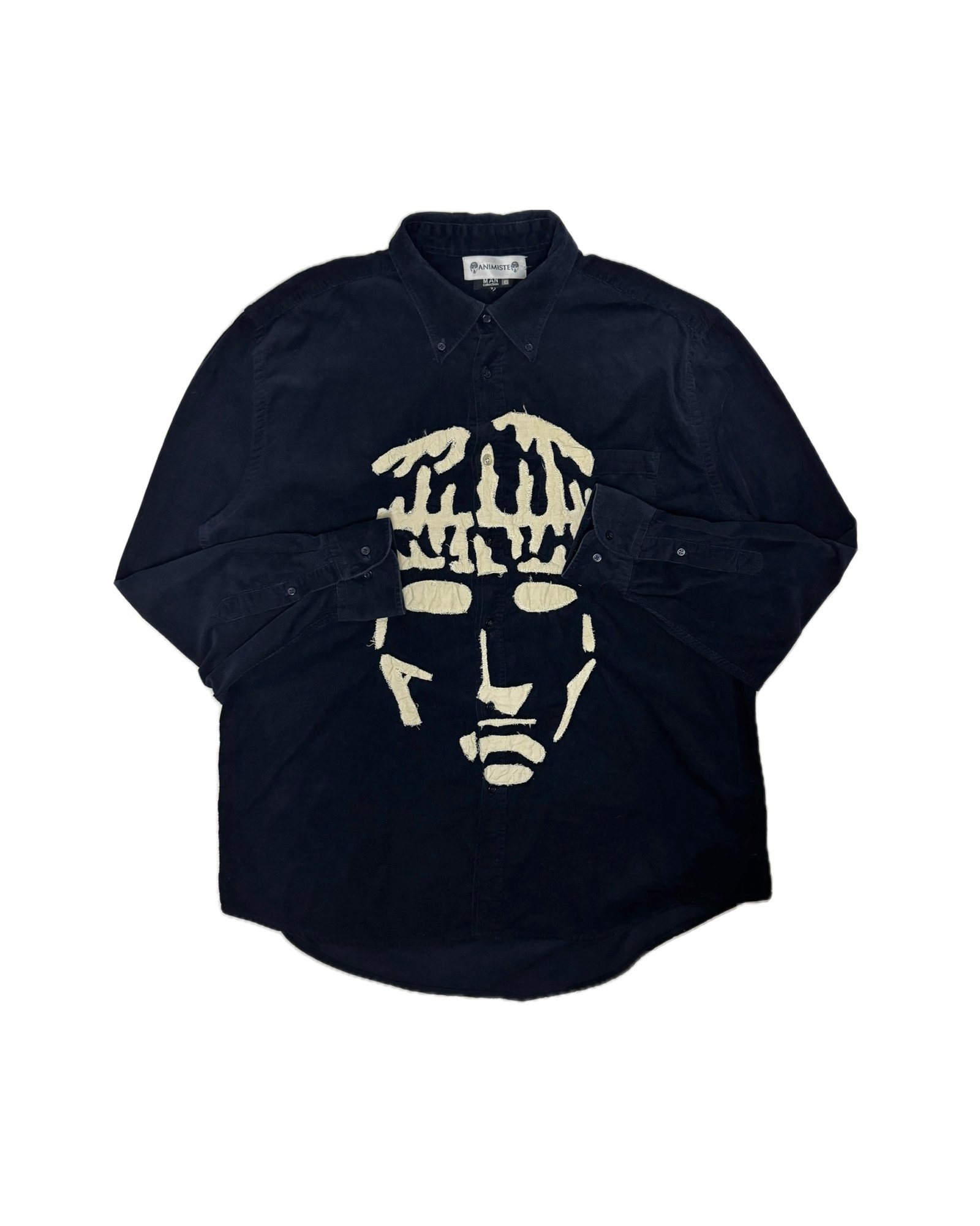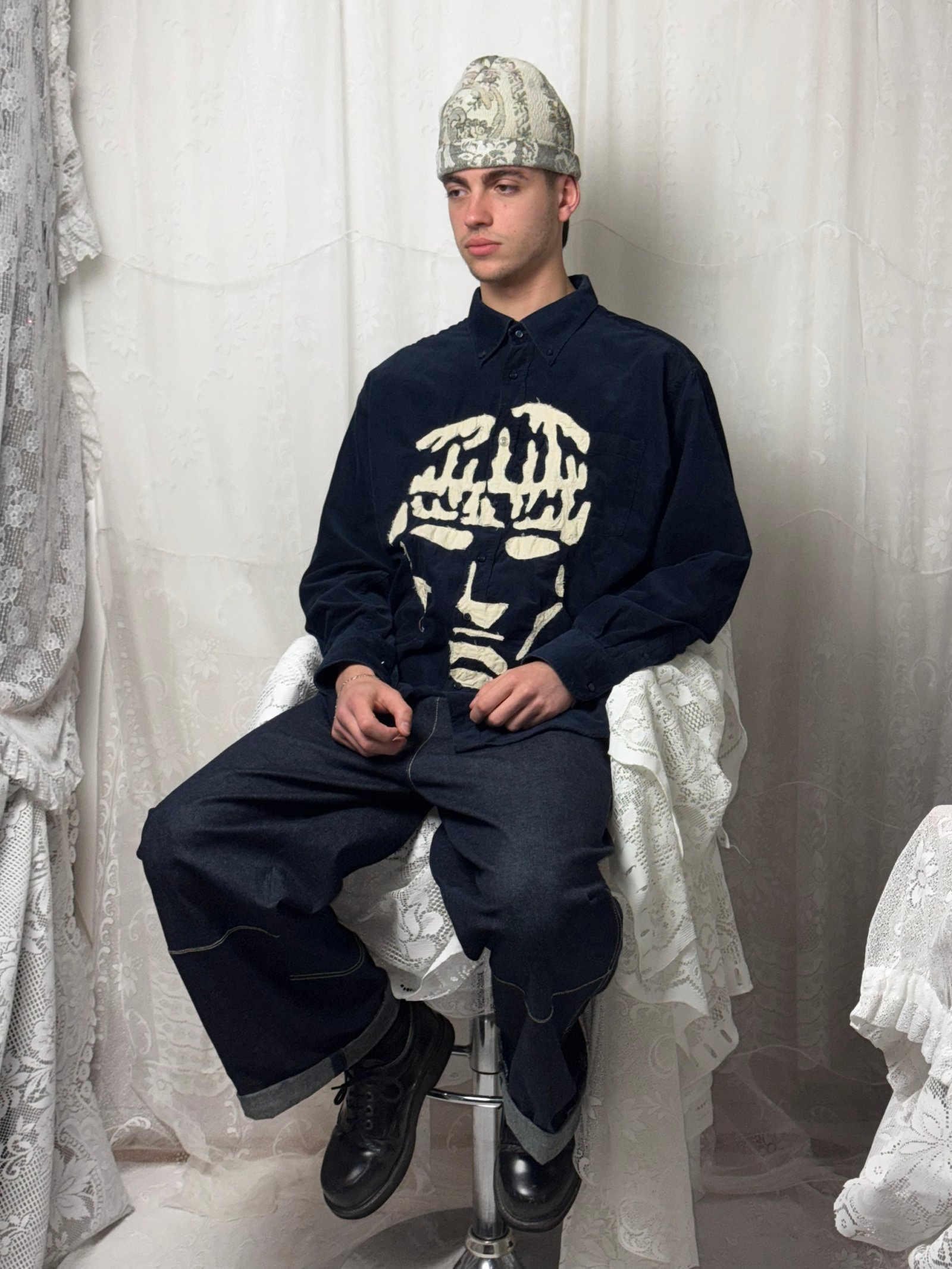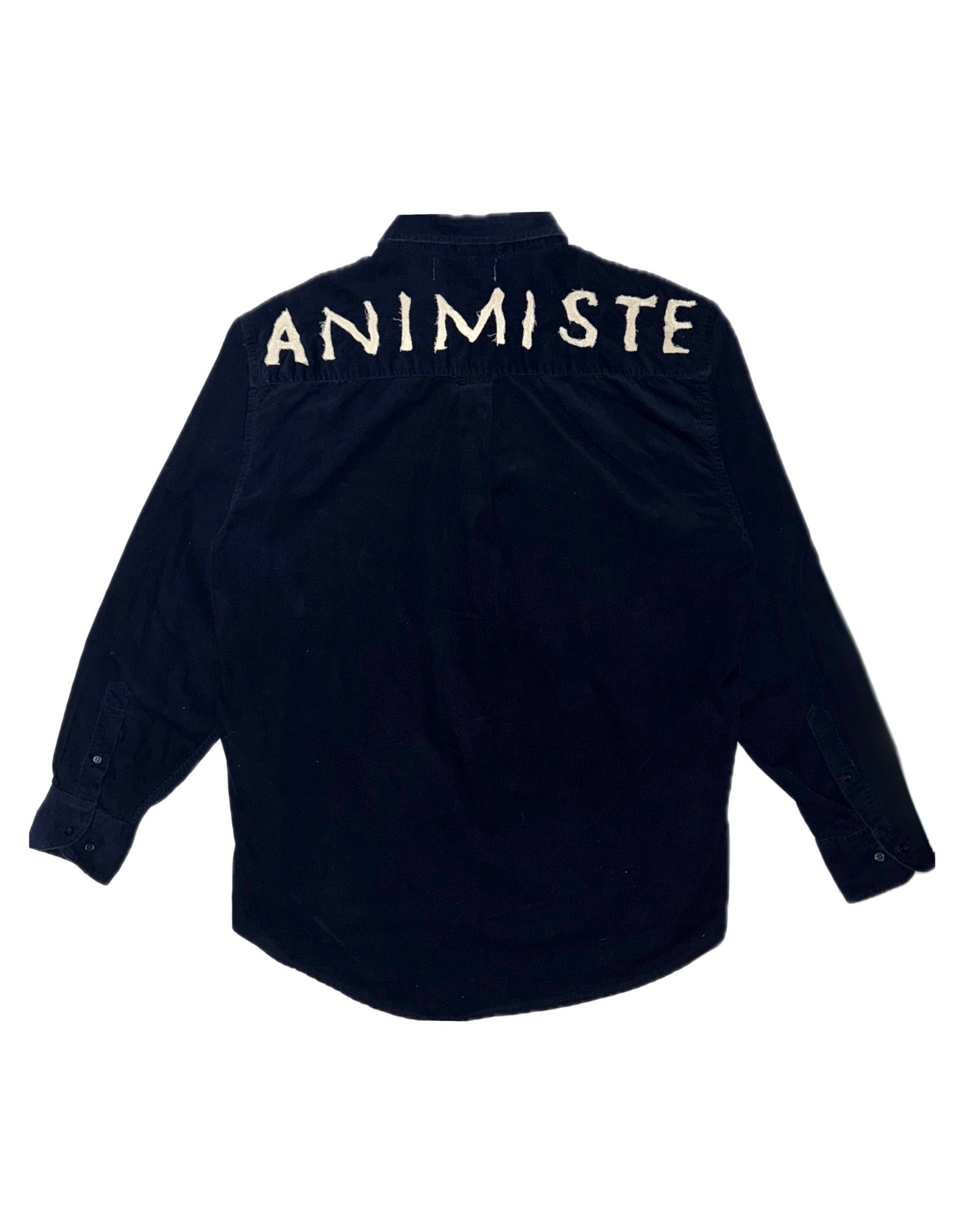 Chemise en velours côtelé customé, coupé oversize, pacthwork logo animiste Size ChartCette coupe est adaptable selon vos mensurations allant du M au L. Mensurations des mannequins pour référence : 1er mannequin : 1,85m