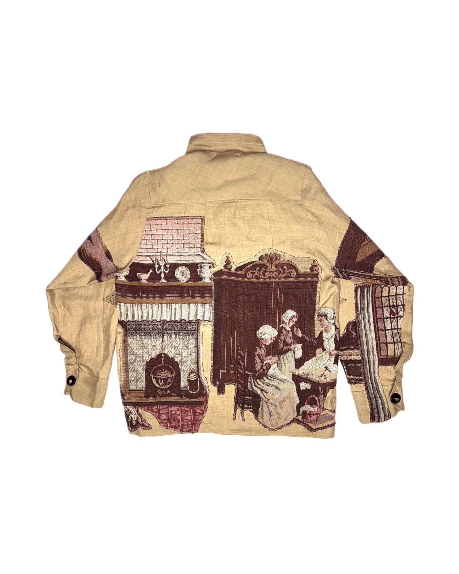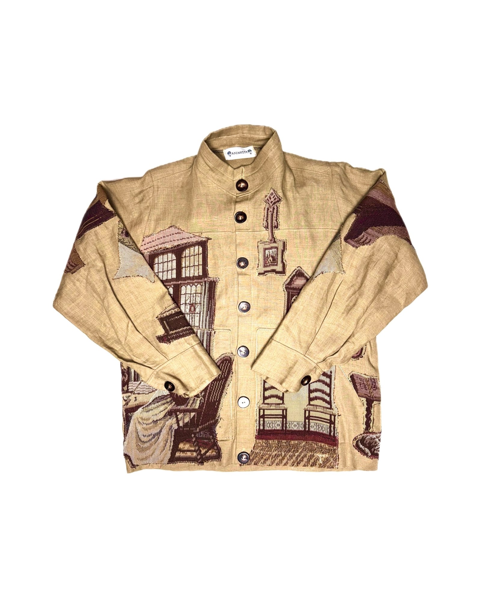 - Veste confectionnée dans un tissu beige orné de motifs tissés.